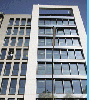 Die klare Ordnung der Fassade steht in logischem Zusammenhang mit den Büros; so wie sich die Fassade in zwei Elementen gliedert, so lässt sich auch die Bürofläche dahinter in zwei Einheiten teilen. Jede Mieteinheit erhält somit eine von außen klar erkennbare eigenständige Fassadenfläche.